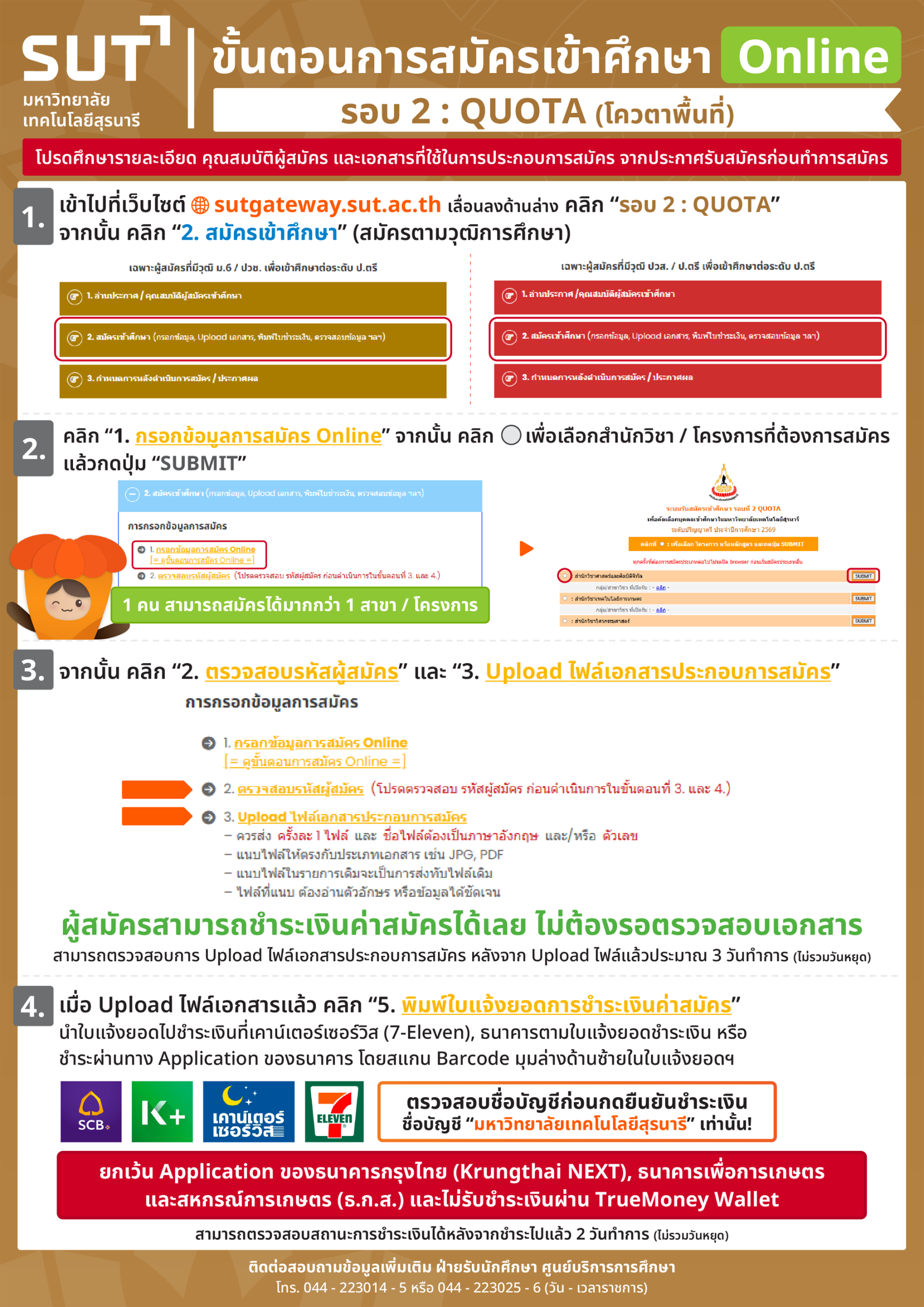 - ผู้ผ่านการคัดเลือกเข้าศึกษาที่ยืนยันสิทธิ์ผ่านระบบ Clearing House ทุกคน จะต้องดำเนินการชำระเงินค่ายืนยันสิทธิ์เข้าศึกษา เพื่อขึ้นทะเบียนเป็นนักศึกษาของมหาวิทยาลัยเทคโนโลยีสุรนารี ตามขั้นตอนและวิธีการที่มหาวิทยาลัยกำหนด ระหว่างวันที่ 11 – 16 ก.พ. 65 ซึ่งจะประกาศรายละเอียดให้ทราบต่อไป