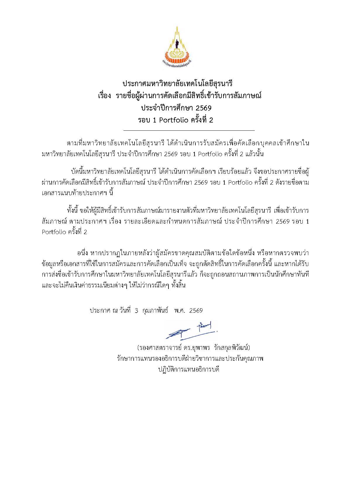ประกาศรายชื่อผู้ผ่านการคัดเลือกมีสิทธิ์เข้ารับการสอบสัมภาษณ์ รอบที่ 1 : Portfolio ครั้งที่ 2 ประจำปีการศึกษา 2569