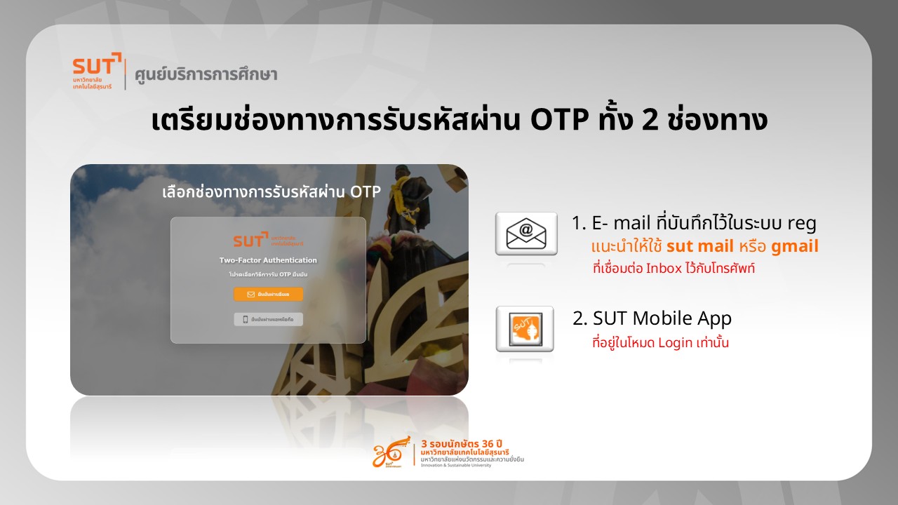 - ติดตั้ง SUT Mobile App เพื่อความสะดวกในการรับรหัส OTP [อ่านวิธีติดตั้ง SUT Mobile App]